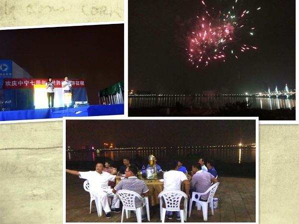 “請大家舉起酒杯,現在我宣布中寧建筑公司七周年晚宴現在開始”,在董事長胡總的豪邁聲下,席間人員共同舉杯,一飲而盡。此刻,空中綻放著煙花,絢麗多彩。七箱美麗的煙花,瞬間閃亮了贛江兩畔。
