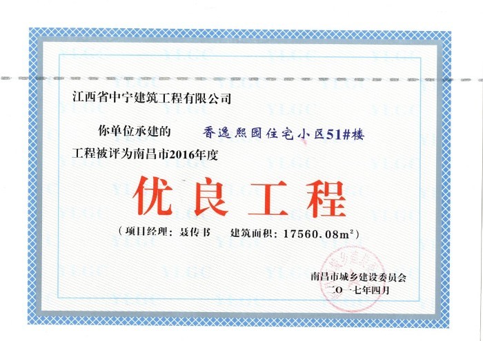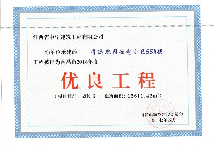 本報訊 由我公司承建的江西省南昌市灣里區香逸熙園住宅小區項目51#樓、52#樓、55#樓,被評為南昌市2016年度“優良工程”。