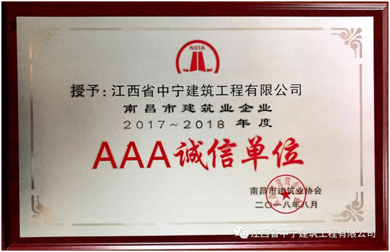 近日,由南昌市建筑業協會組織的2017-2018年度南昌建筑業企業誠信公布審批,我司榮獲“南昌市2017-2018年度AAA誠信單位”稱號,得此榮譽,離不開公司一直以來倡導的誠信企業文化,更離不開中寧人一直堅守的誠信信念。