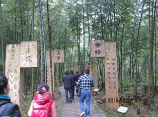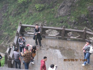 在明月廣場合完影后,大家一同欣賞著云姑沐月的唯美雕像。入景區的大門前擺放著各式叫賣的工藝品,無論大人與小孩都在停步觀賞,素不知還有更重要的事情在等待著我們。入大門整隊買票可不是件簡單的事情,由于今日天氣好,踏春的人比較多。整個團隊一同穿過詠月碑林時,大家都在嘆為觀止,因為,在無數的碑文上記載著先人與后人對于明月山的敬仰。在朱熹涼亭前,大家商議,如何踏上明月山。因來的人群中有中寧幼小的子民,考慮再三,分兵兩路。幼童坐纜車上去,徐聰為小分隊隊長;其他成年人等,徒步上山,蔡文斌為先鋒官,胡董為隊長。在目視小分隊踏上纜車的小途時,我們也開始了今天的艱巨任務,完成踏上明月山的中寧夢想。