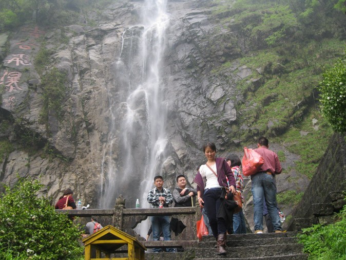 到達明月山,大家都迫不及待的下車。一下車,高高的明月山聳立在眼前,像是站在巨人的腳底下,感覺自己非常非常的渺小,比夢中想象的還要雄偉、高大。“莫急、莫急,大家先合個影”只聽見行政部付迎的呼聲,還好,此時正是大家對明月山驚訝的時候,沒有大家說話的聲音。不然,平時小聲小氣的付迎,是沒有辦法讓大家都能聽得見她的聲音的。