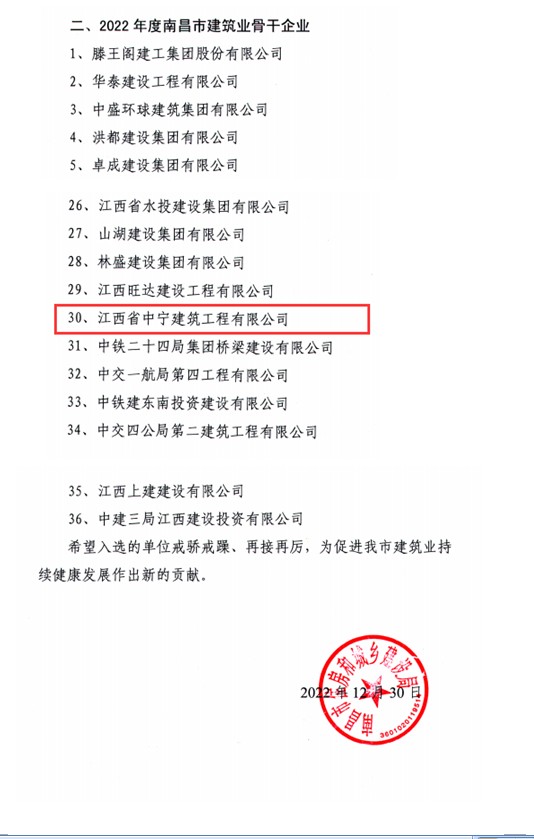 近日,南昌市住房和城鄉(xiāng)建設(shè)局發(fā)布了《關(guān)于公布2022年度南昌市建筑業(yè)龍頭、骨干企業(yè)名單的通報》,江西省中寧建筑工程有限公司榮獲“2022年度南昌市建筑業(yè)骨干企業(yè)”榮譽(yù)稱號。